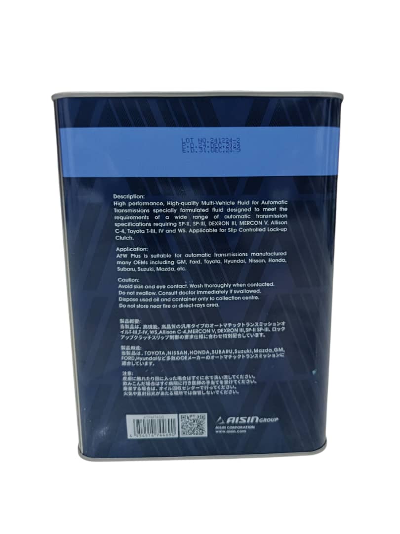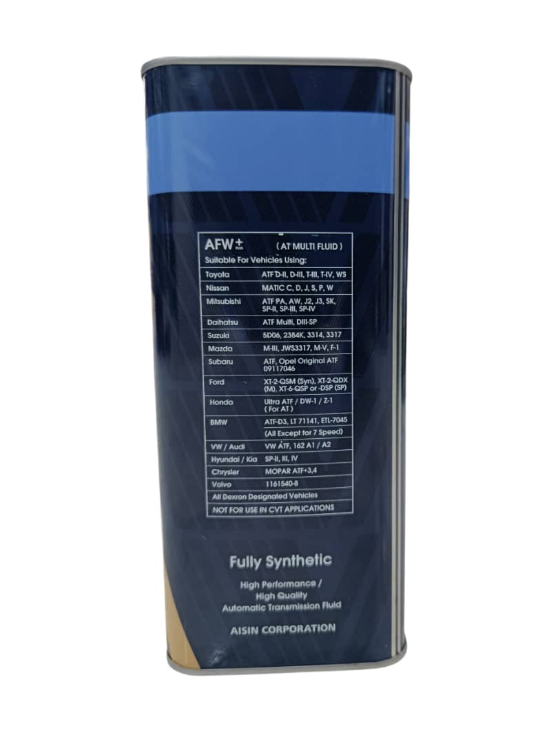 AISIN Fully Synthetic ATF is a high-performance, premium quality Multi-Vehicle Fluid for Automatic Transmissions. (Applicable for Slip controlled lock-up clutch). Aisin AFW+ is a specially formulated fluid designed to meet the requirements of a wide range of Automatic Transmission Specifications requiring SP-II, SP-III, DEXRON III, MERCON V, Allison C-4, Toyota T-III and IV. In addition, it meets the requirements of European OEM’s like ZF-TE-ML-14A, Voith 55.6335, MAN 339 Type Z-1, and MB, VW, BMW 4, 5 and 6-speed automatic transmission specifications.